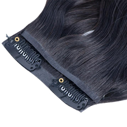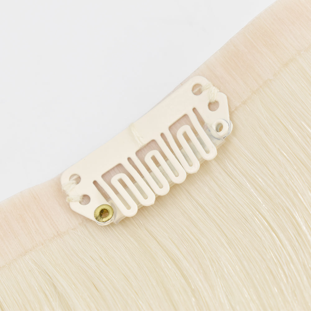 Unser zauberhaftes one piece Seamless Clip-In-Extension wiegt 50g hat eine Länge von ca. 23cm und bietet dir die Möglichkeit, eine bezaubernde Haarverdichtung zu erzielen, die sich nahtlos in dein eigenes Haar einfügt. Für eine ganze Verlängerung empfehlen wir 3 Haarteile. Dank des einzigartigen Silikonbands, das auch als Skinweft bekannt ist, wird die Integration der Extensions so unauffällig, dass es hier zu keinem unerwünschtem Volumen am Oberkopf kommt. Sie liegen ganz dicht am Kopf an, ähnlich wie bei Tape-Extensions, und sorgen für ein leichtes und angenehmes Tragegefühl. Mit dem Skinweft kannst du den Clip sogar höher im Eigenhaar platzieren als mit herkömmlich genähten Extensions.