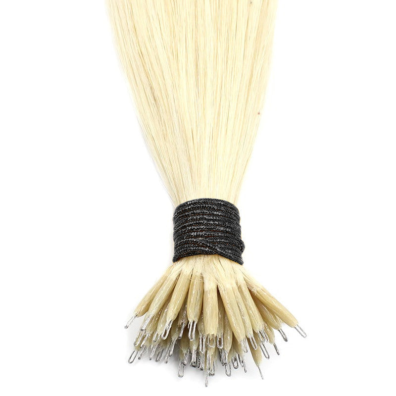 Nanoring Extensions sind eine der beliebtesten Methoden für feines und empfindliches Haar zum Hinzufügen von Länge und Volumen zu natürlichem Haar ohne Hitze oder „Kleber“ Die Extensions werden in der Kaltmethode- mit Nanoringen Strähne für Strähne in das Eigenhaar eingearbeiten und mit einer Zange befestigt, was eine sichere und dauerhafte Verbindung garantiert, (wie bei klassischen bondings) nur ohne Kleber oder Wärme. Die Befestigung kann leicht wieder entfernt werden, auch selbst daheim. Nanoring Extensions sind besonders geeignet für Personen mit feinem oder dünnem Haar, da sie ein feines natürliches Aussehen verleihen, ohne dass das Haar beschwert wird. Unsere Extensions bestehen aus reinem hochwertigem Echthaar. *Nanoringe sind nicht enthalten